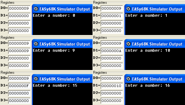 Note that when the input is 10 D1 contains A. this is because the registers show data in Hexadecimal format. |