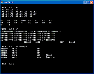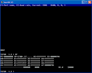 | Tutor - The Tutor monitor program from the original Motorola Education Computer board modified for EASy68K. | DumbTerm by Charles Kelly : A dumb serial terminal program for EASy68K v5.0.0 or newer. Demonstrates serial communications. |
