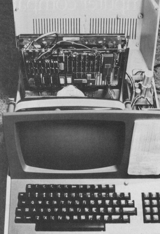 Photo 4: The ECB fits neatly into a Heathkit H-19 terminal. Regulated power is obtained from the H-19 through the wires in the upper left. The serial output of the terminal goes directly to the ECB, and the host port of the ECB is wired to the serial output port of the H-19. Separate holes punched in the rear chassis are for the cassette and disk I/O connectors.